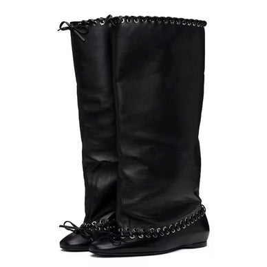 Elevate your everyday look with the Luxe Slouch Lace-Trim Boots—where comfort meets runway edge. Featuring a relaxed, oversized silhouette with lace-inspired grommet trim and delicate bow ties, these knee-high flats are designed to make a statement without sacrificing all-day wearability.