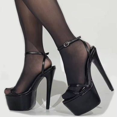 Featuring a towering 8-inch stiletto heel balanced with a 3-inch front platform, these sandals elongate your silhouette while maintaining stability. The sleek ankle strap with a delicate buckle secures your foot in place, while the minimal twin-strap design across the toes keeps the look clean, sharp, and unapologetically sexy.